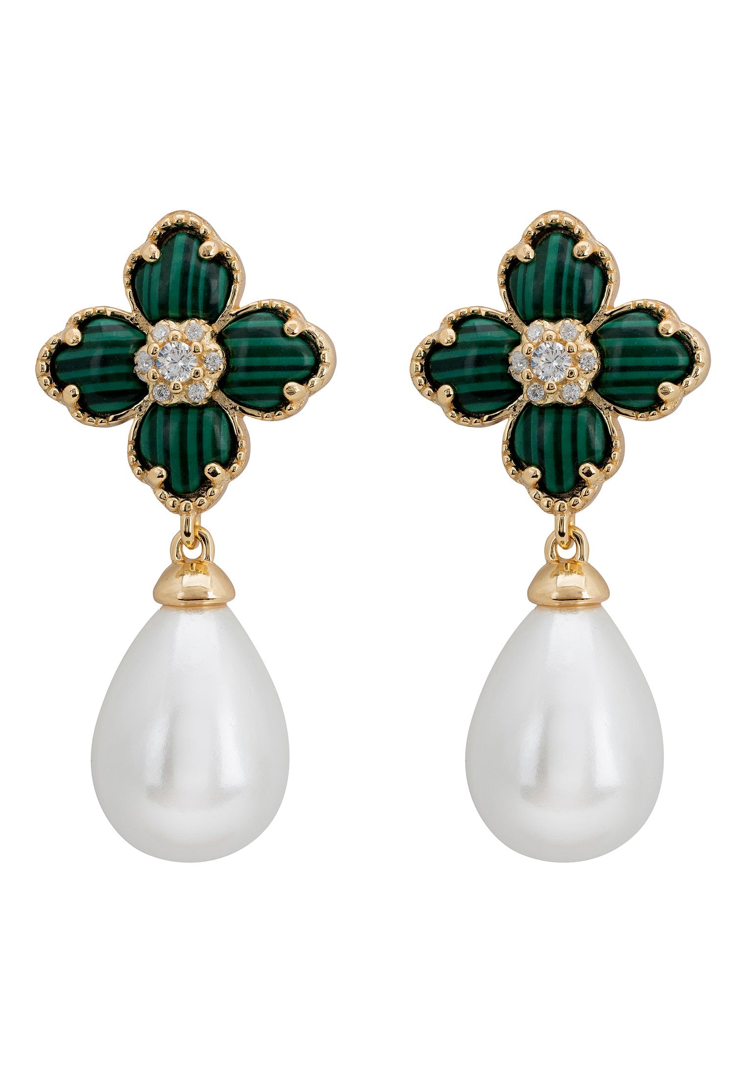 Flower Clover Pearl Drop Earrings Malachite Gold