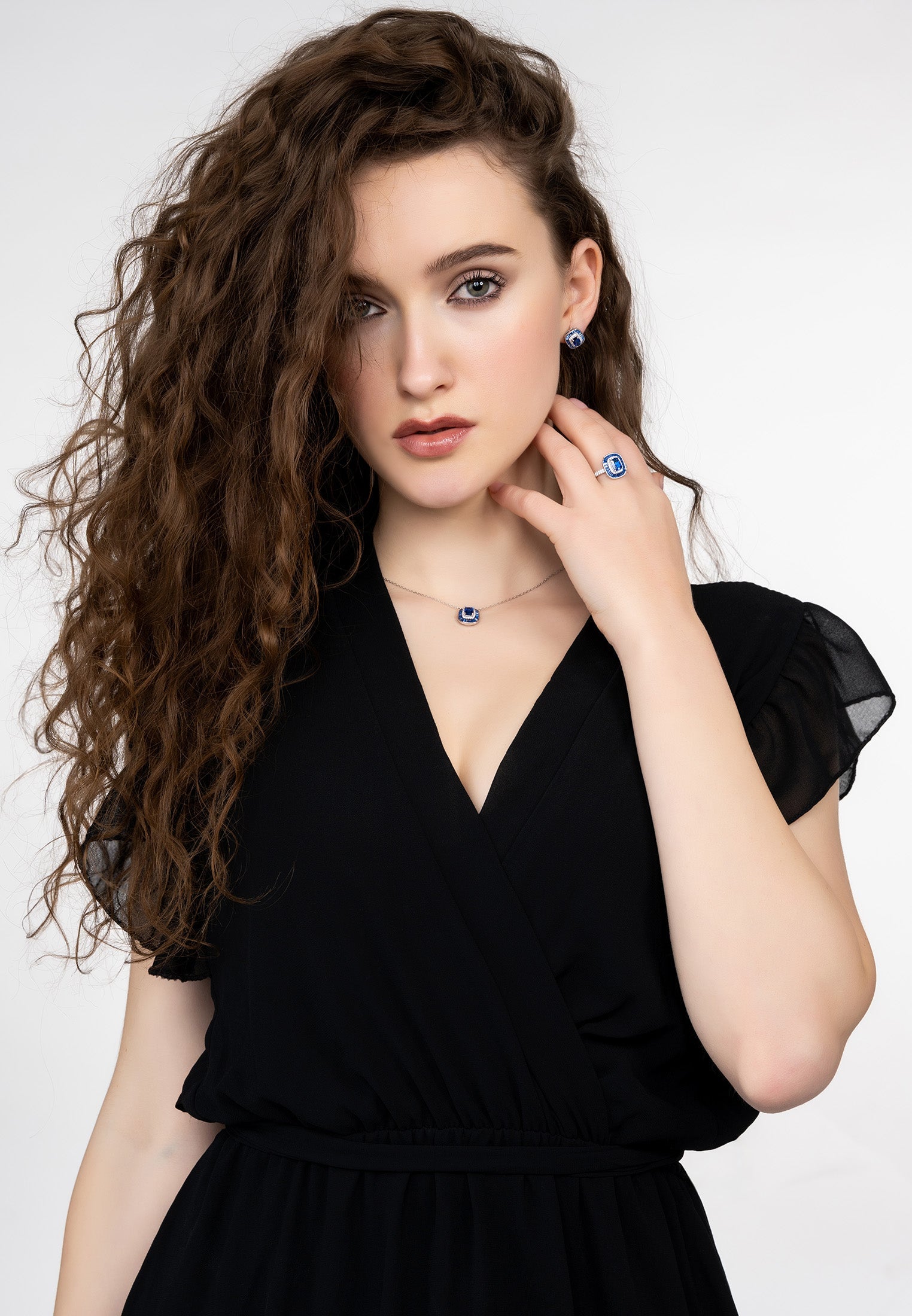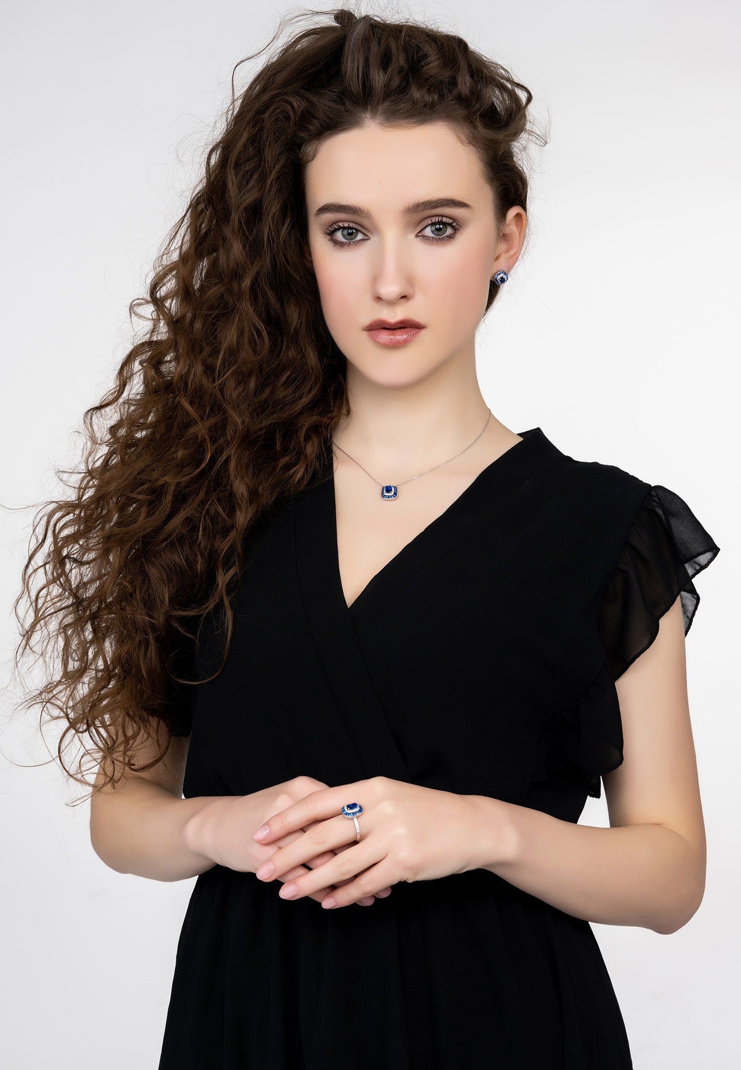 Each earring showcases a central rectangular sapphire, framed by a luminous circle of cubic zirconia. For that extra dash of panache, baguette-cut gems decorate the outer edges. These studs are easy to wear and remove, thanks to their post and butterfly fastening. With a size of 1.2 x 1.0 cm and a weight of 3.4 grams, they offer both comfort and impact. Want to go full-on fabulous? Pair these beauties with our matching pendant necklace and cocktail ring.