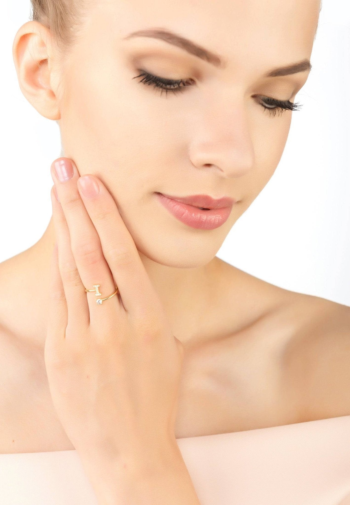 Pretty and petite, this initial ring features an open band, which allows for slight adjustability with sizing. The opening is designed to be on top of your finger, where your zircon adorned monogram is on one side and a single larger cubic zirconia resides on the other.