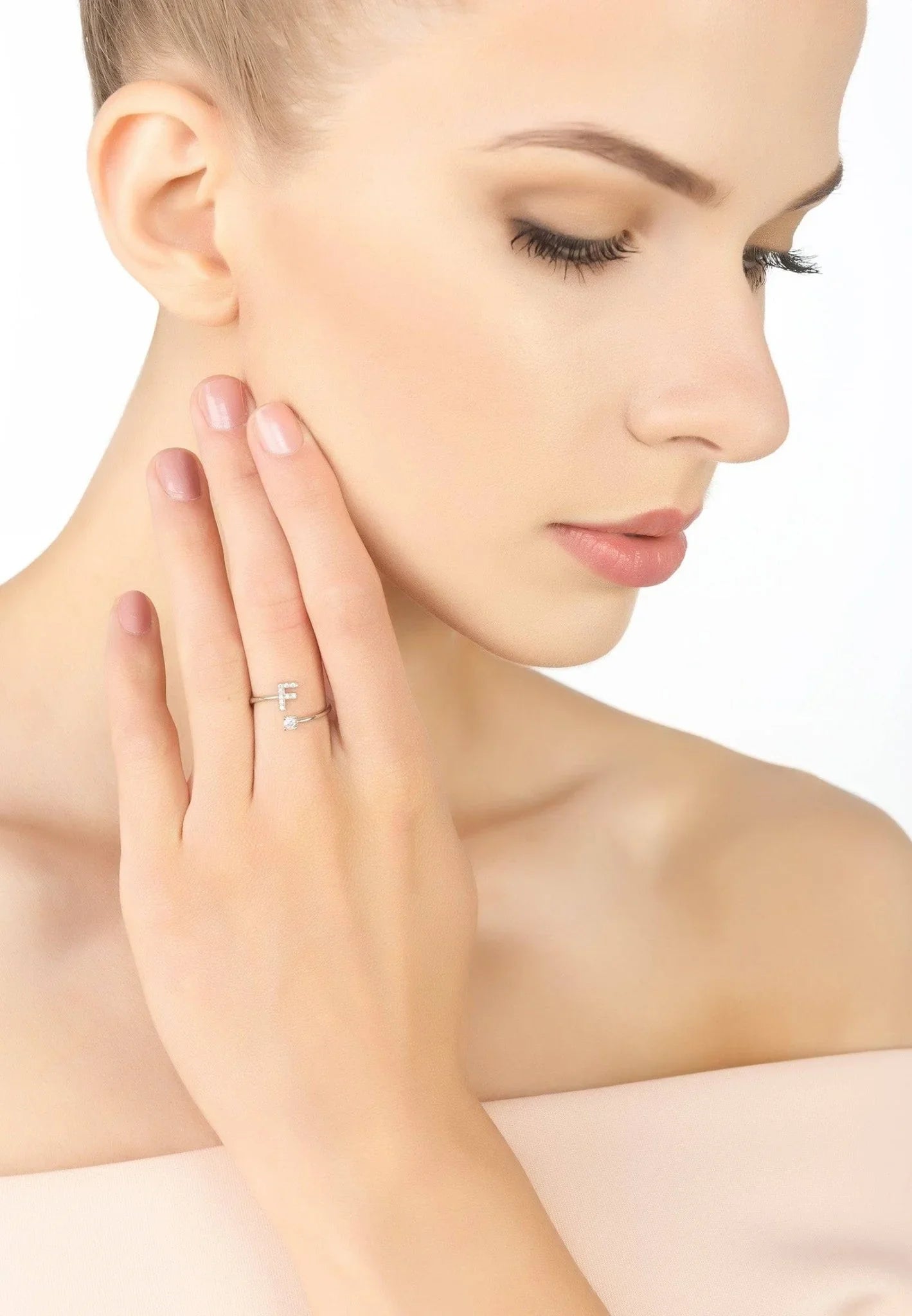 Pretty and petite, this initial ring features an open band, which allows for slight adjustability with sizing. The opening is designed to be on top of your finger, where your zircon adorned monogram is on one side and a single larger cubic zirconia resides on the other.