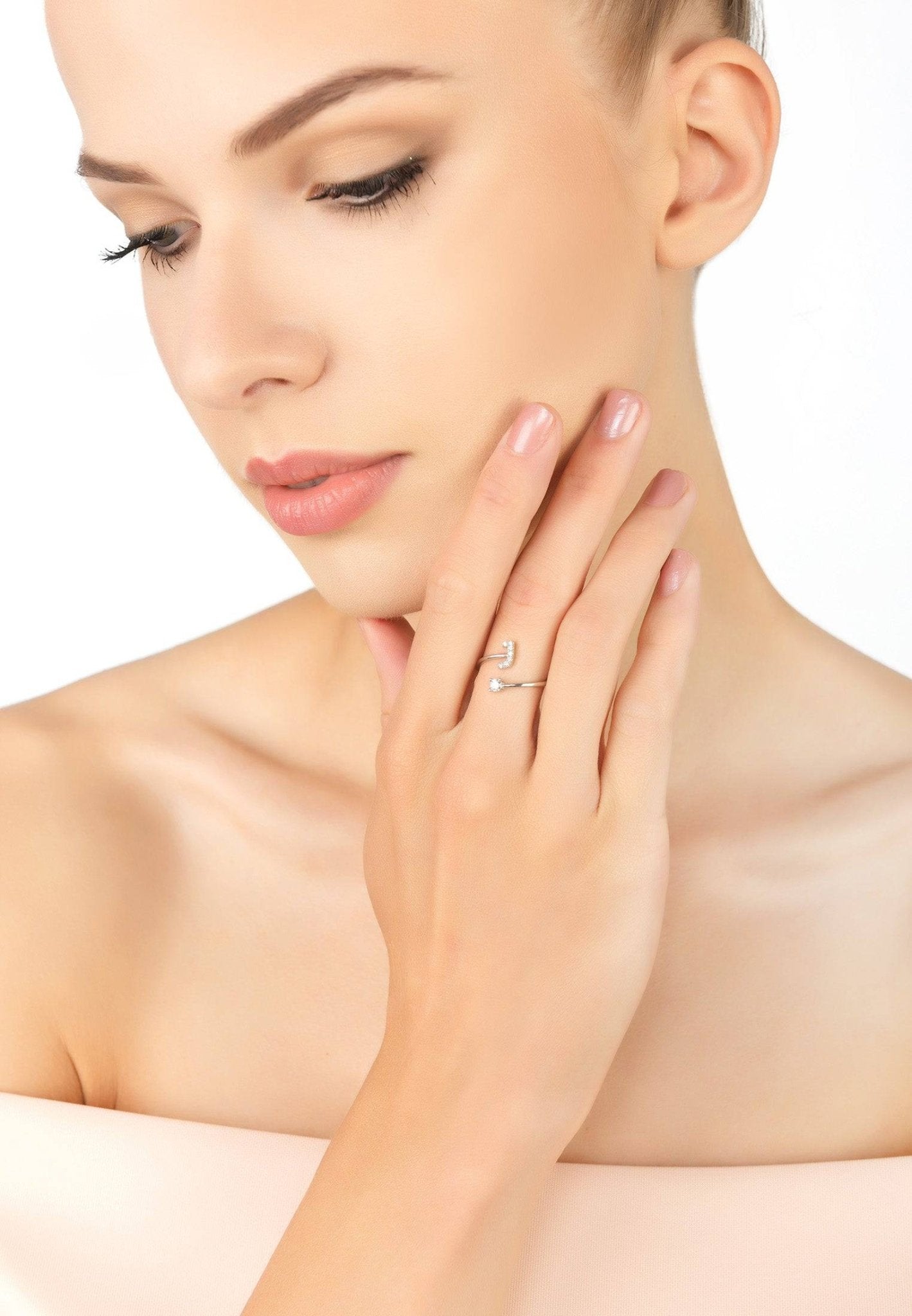 Pretty and petite, this initial ring features an open band, which allows for slight adjustability with sizing. The opening is designed to be on top of your finger, where your zircon adorned monogram is on one side and a single larger cubic zirconia resides on the other.