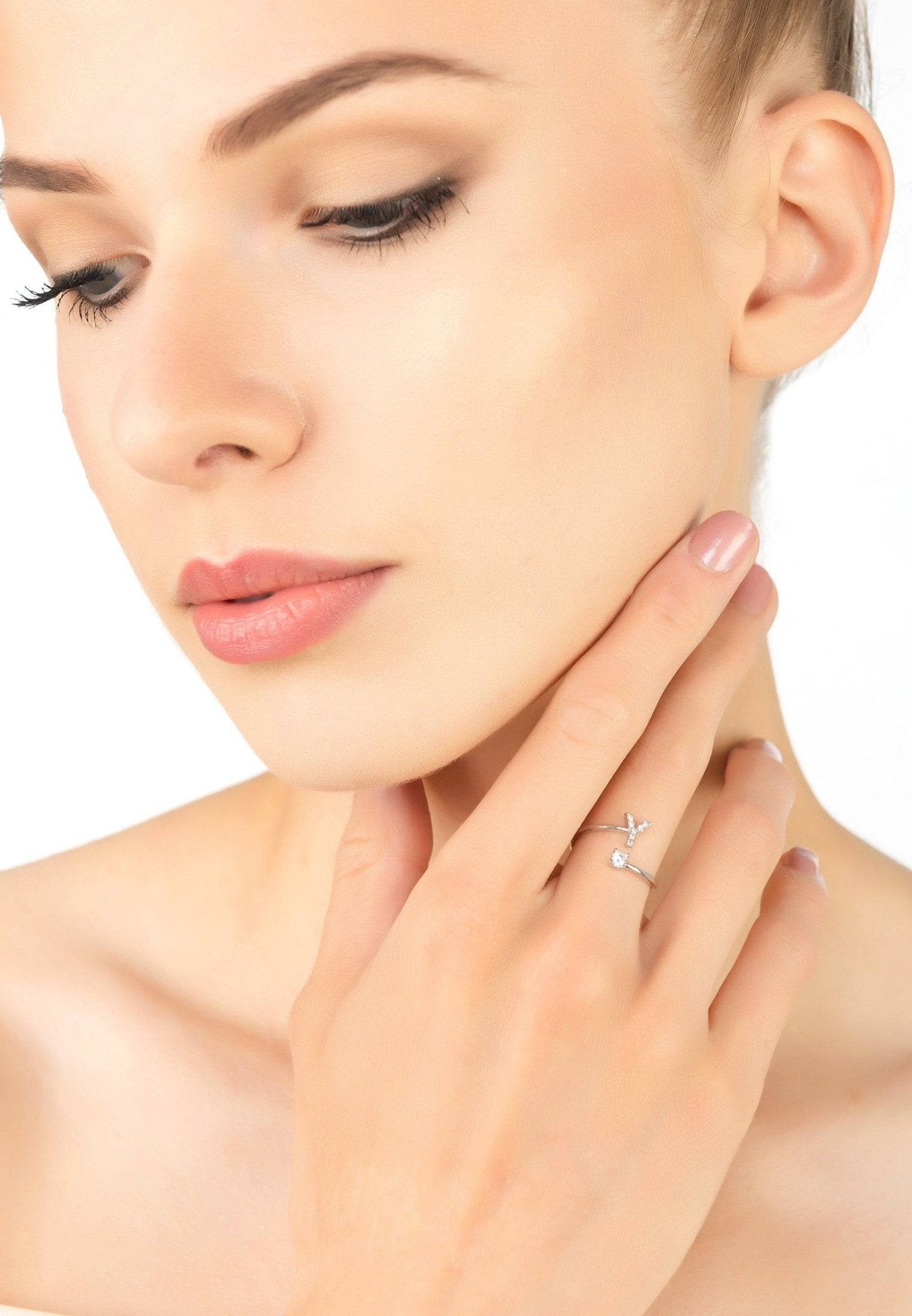Pretty and petite, this initial ring features an open band, which allows for slight adjustability with sizing. The opening is designed to be on top of your finger, where your zircon adorned monogram is on one side and a single larger cubic zirconia resides on the other.