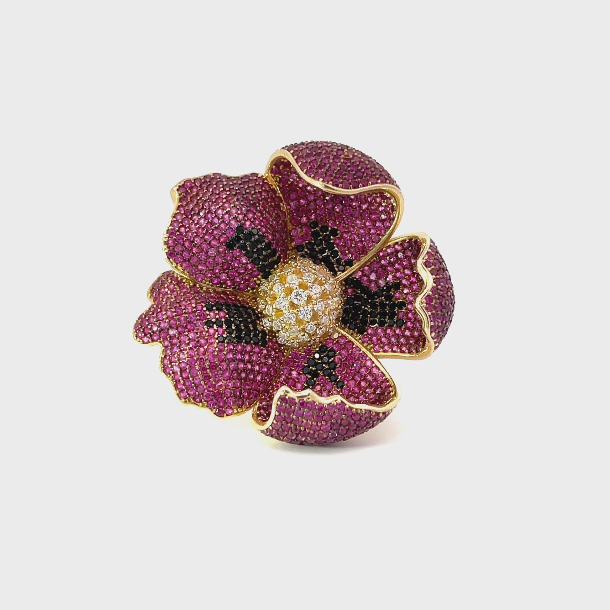 This large poppy cocktail ring is adorned with sparkling ruby red and black cubic zirconia on the petals and brilliant white at its centre, made in a three dimensional style for added interest, which will add a touch of sophisticated style to any outfit.