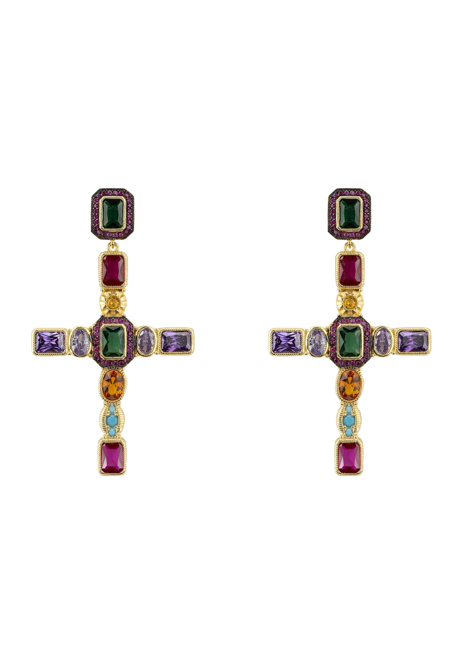 Introducing the Santa Maria Extra Large Gemstone Cross Earrings in Gold - a bold and beautiful statement piece that marries timeless elegance with a splash of vibrant colour. Crafted from high-quality 925 sterling silver and luxuriously dipped in 18ct gold, these earrings are designed to dazzle and delight. Adorned with vibrant lab-grown gemstones including turquoise, amethyst, ruby, quartz, and emerald. The colourful gems intricately cover the crosses, making each piece a vivid masterpiece.