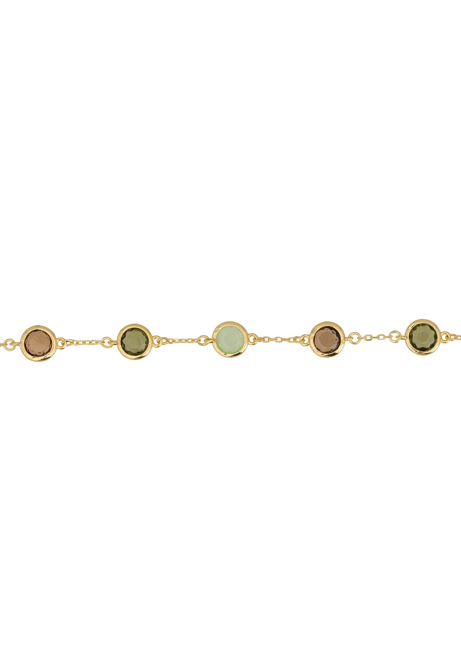 This bracelet is crafted from premium 925 sterling silver and coated in rich 18ct gold, weighing a mere 3.5 grams for effortless wear. Its design features a refined chain at 16.5 - 20.0cm long, dotted with round 0.60cm diameter gemstones that include the vibrant Peridot, the tranquil Aqua Chalcedony, and the mysterious Smokey Quartz.