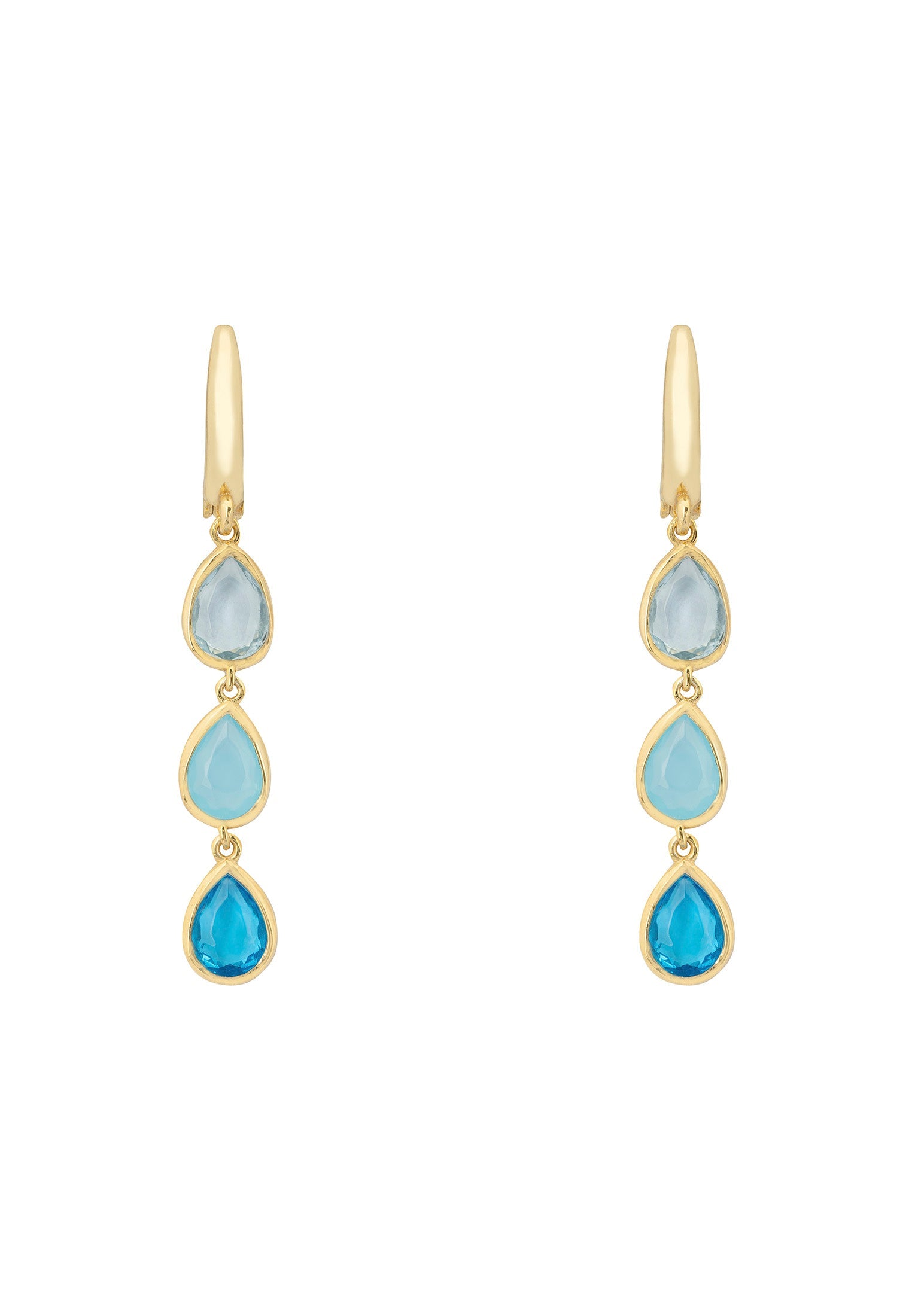 These earrings, crafted from 925 sterling silver and finished with a gleaming coat of 18ct gold, are as light as air at 2.25 grams and measure a graceful 4cm in length. Each earring is adorned with a trio of teardrop gemstones - the clear sky elegance of Blue Topaz, the gentle whisper of Blue Chalcedony, and the vibrant depth of Swiss Blue Topaz, creating a cascading effect of tranquil blues that evoke the spirit of the sea and sky.