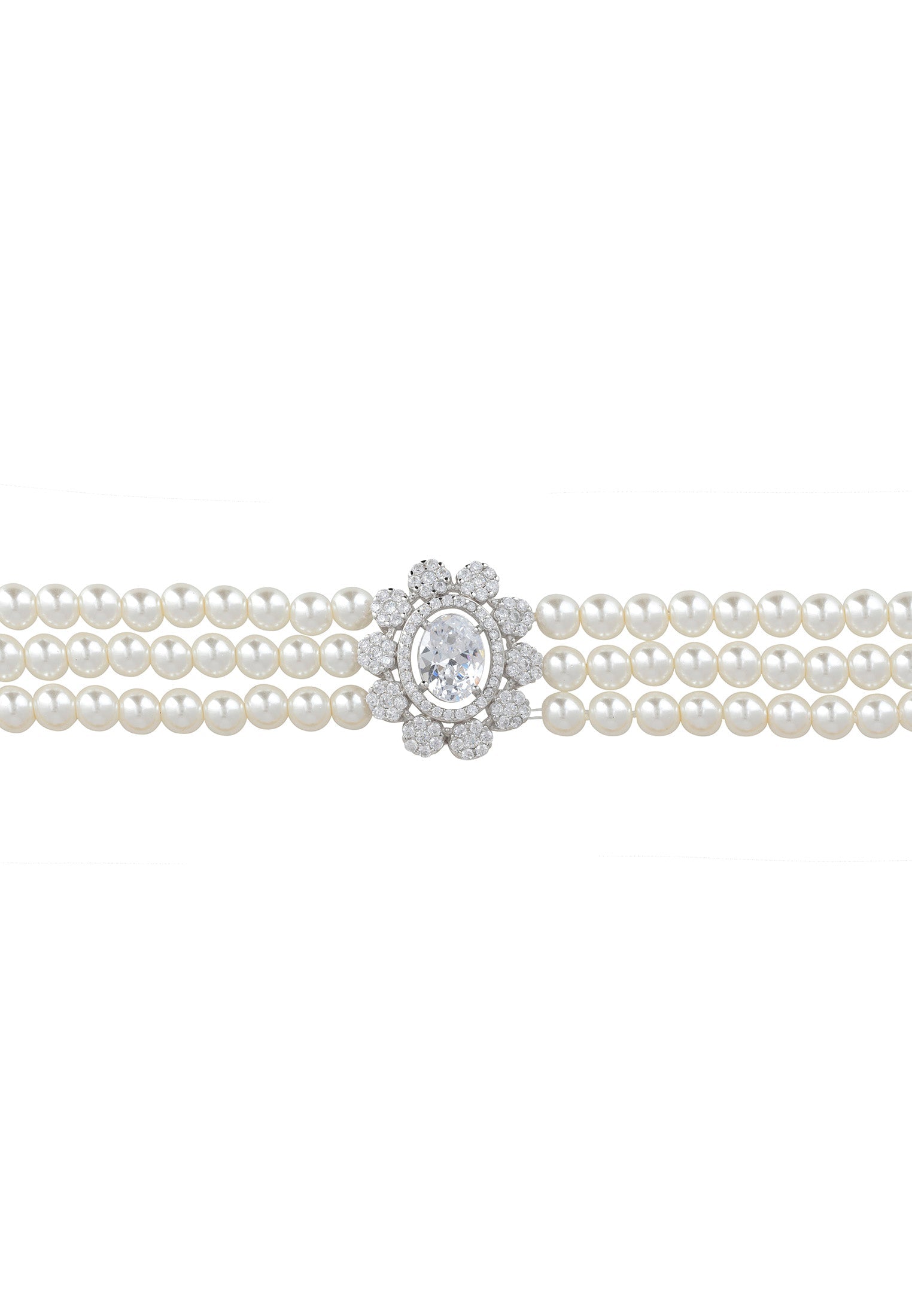 Indulge in the epitome of luxury with our Spencer Pearl Strand Bracelet, a masterpiece crafted from premium 925 sterling silver. This bracelet is a symphony of luxury, featuring three exquisite strands of luminous pearls that wrap gracefully around your wrist, creating a look that is both timeless and contemporary.