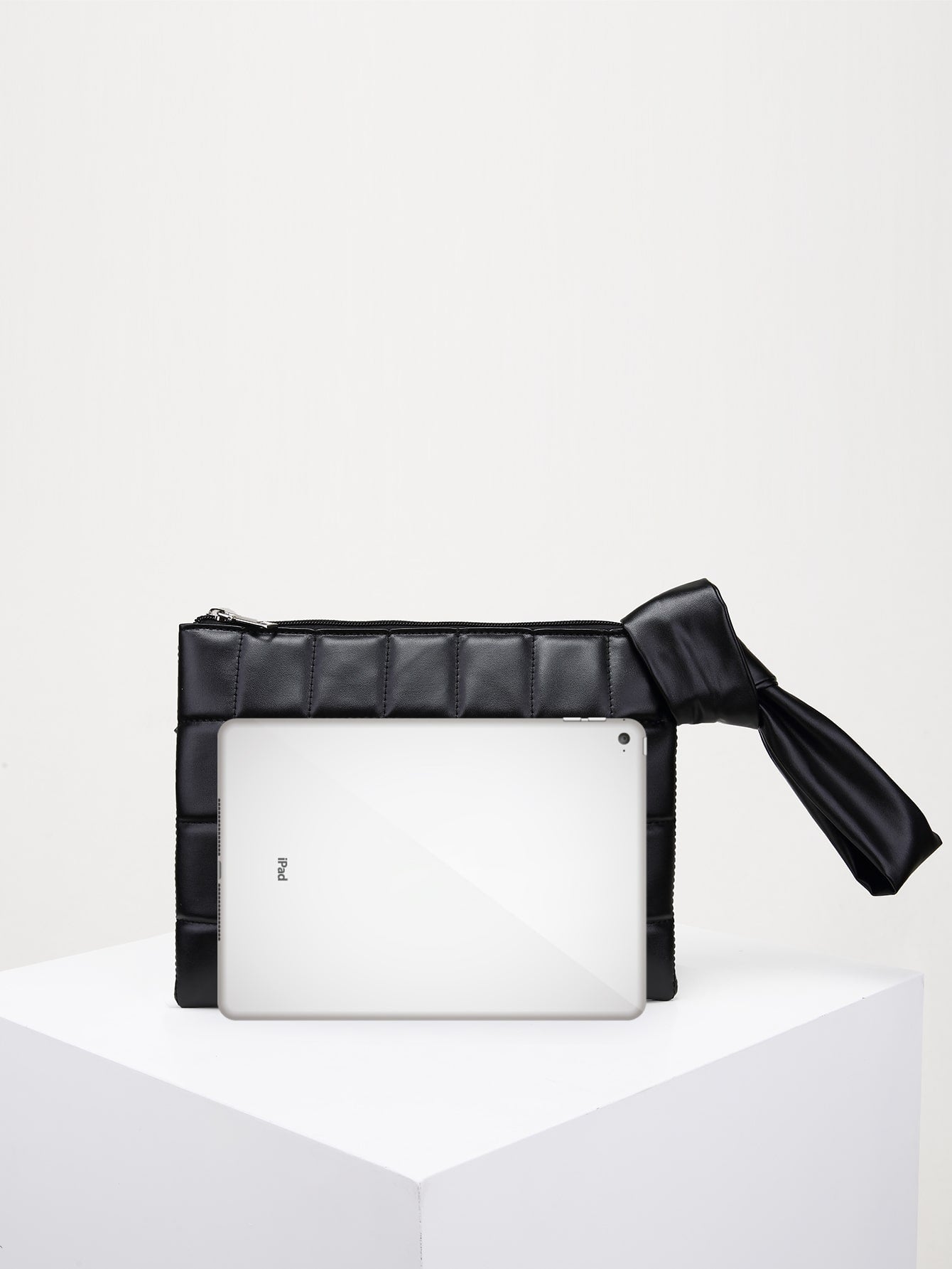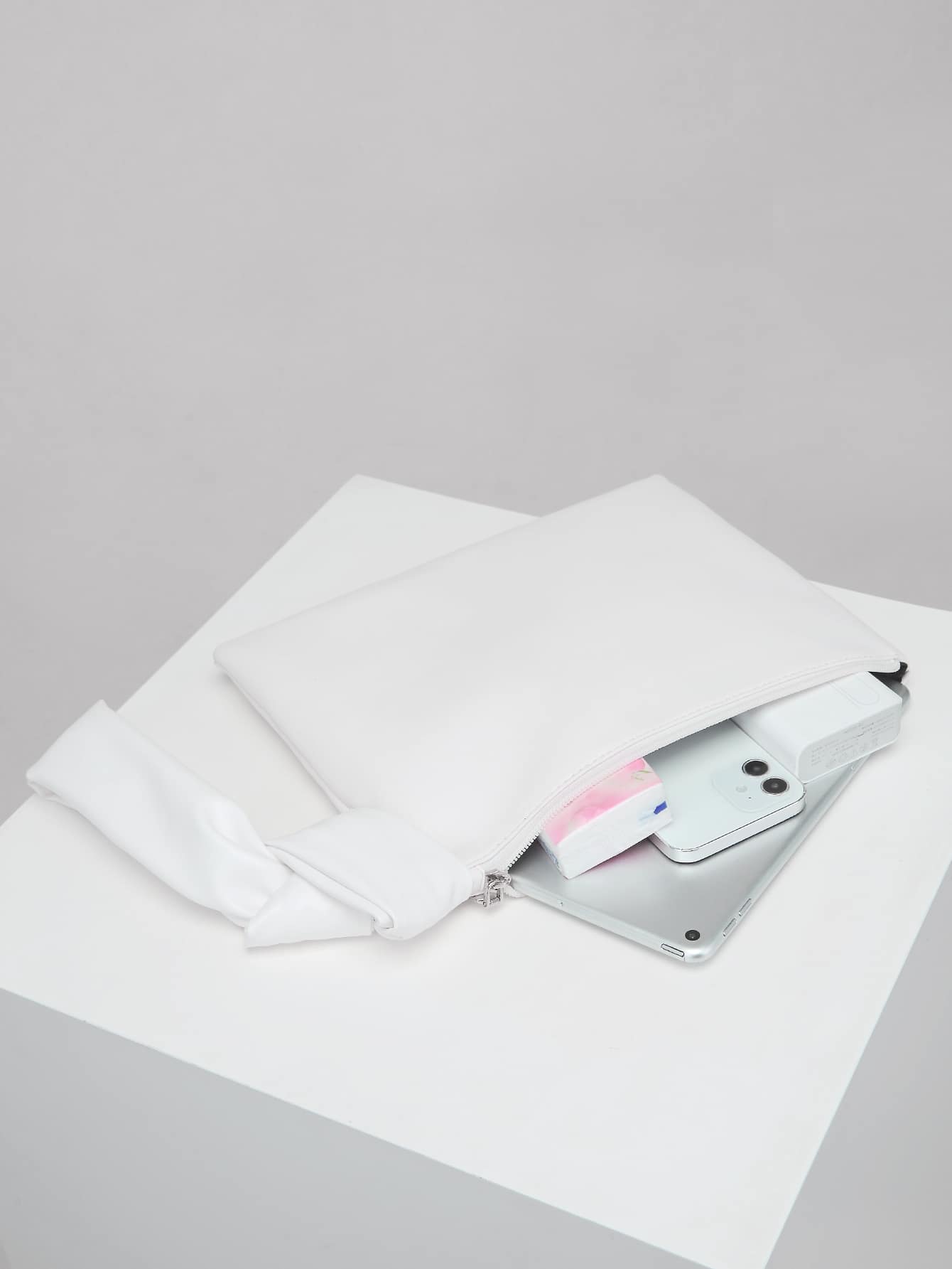 Faatures: soft vegan leather, solid color, zipper closure with wide wrist strap.