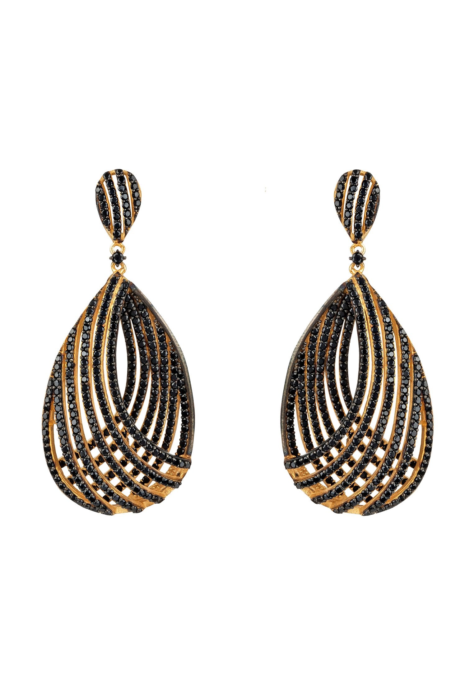 Unleash some serious sparkle, sophistication and style with the Vortex Teardrop Earrings! As an accessory that’s perfect for all special occasions. Handcrafted with 925 sterling silver that has been dipped in gold, the black zircon detailing in this hypnotic design adds undeniable flair. The three dimensional open lattice patterned teardrop will have you hypnotized with its swirling, infinite design. You won’t be able to resist dancing around as if no one is watching thanks to its suspended teardrop stud top that allows for natural movement.